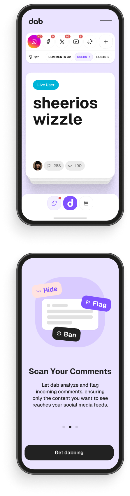 Dab’s AI filters harmful comments in real time, learning your preferences for profanity, sexuality, and detecting emojis and slang used to bypass filters.