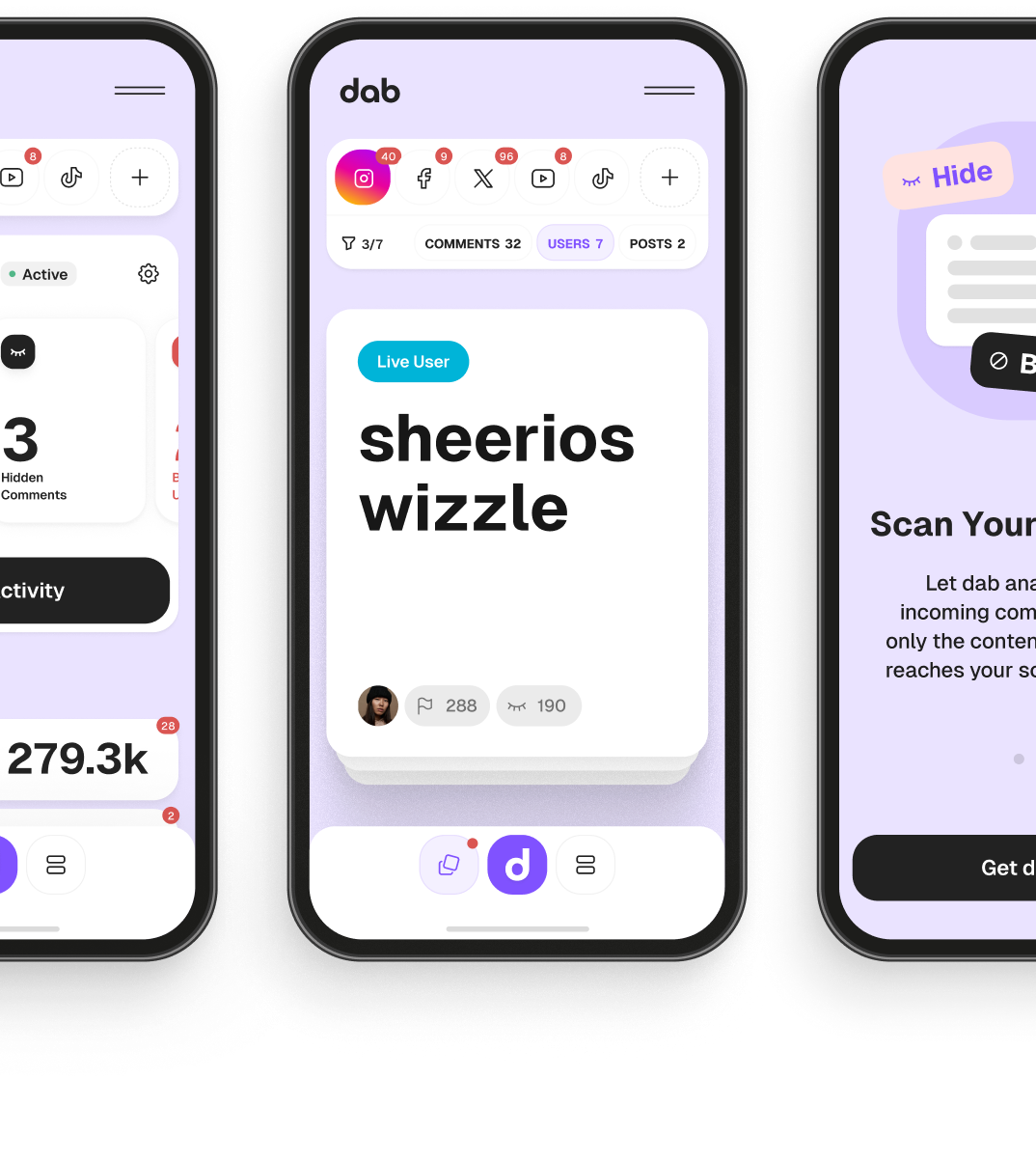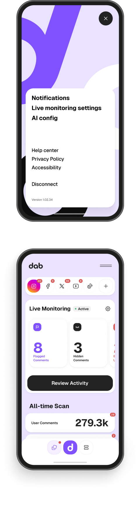 Dab goes beyond platform filters to keep your accounts safe, automatically filtering harmful comments to protect your mental health.